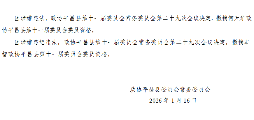 政协平昌县第十一届委员会常务委员会关于撤销何天华、牟智政协平昌县第十一届 委员会委员资格的决定
